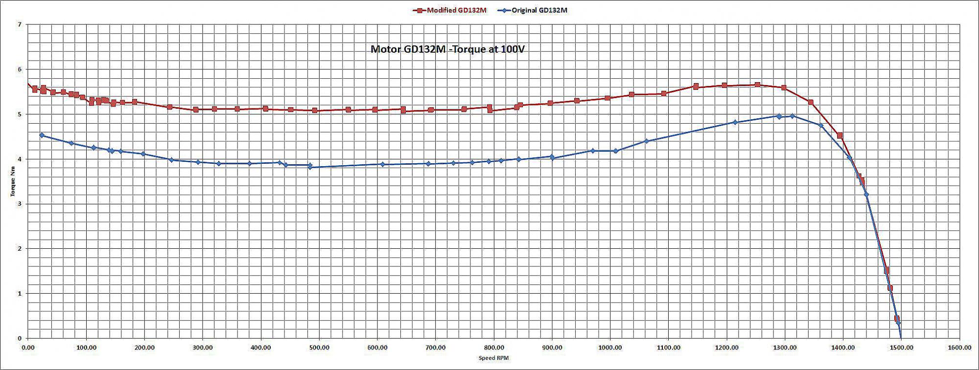 Можете пояснить процесс замеров для этого графика, судя по надписям тестирование было при неизменном напряжении 100в  и неизменной частоте. Тогда для стандартного мотора возможно не хватало напряжения. Как-то сомнительно, что для стандартного и перемотанного оптимальным оказалось ровно одно и то-же напряжение 100в. Посмотреть бы семейство этих графиков при разных напряжениях (85-90-95-100-105-110) .