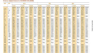 "IEC 60034-30 охватывает практически все двигатели - Одно-трехфазные, 50 Гц и 60 Гц, 2-, 4- или 6-полюсные номинальные мощности двигателя от 0,75 до  375 кВт. Номинальное напряжение до 1000 В, рабочий режим S1 (постоянная нагрузка)  не менее 80% и  S3 (прерывистый режим) не более 20%