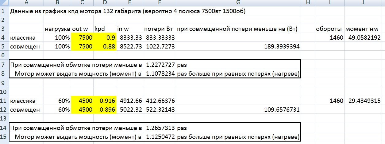 Из приведенного выше графика кпд, получается что при одинаковой нагрузке, при совмещенной обмотке мотор имеет потери на 23-26% меньше. И (упрощенно предполагая что профит по потерям из-за тока, и квадратичную зависимость потерь от тока) может выдать мощность (момент) на 10-12% больше при одинаковых потерях с классикой. (это если оба графика сняты при оптимальных питающих напряжениях).