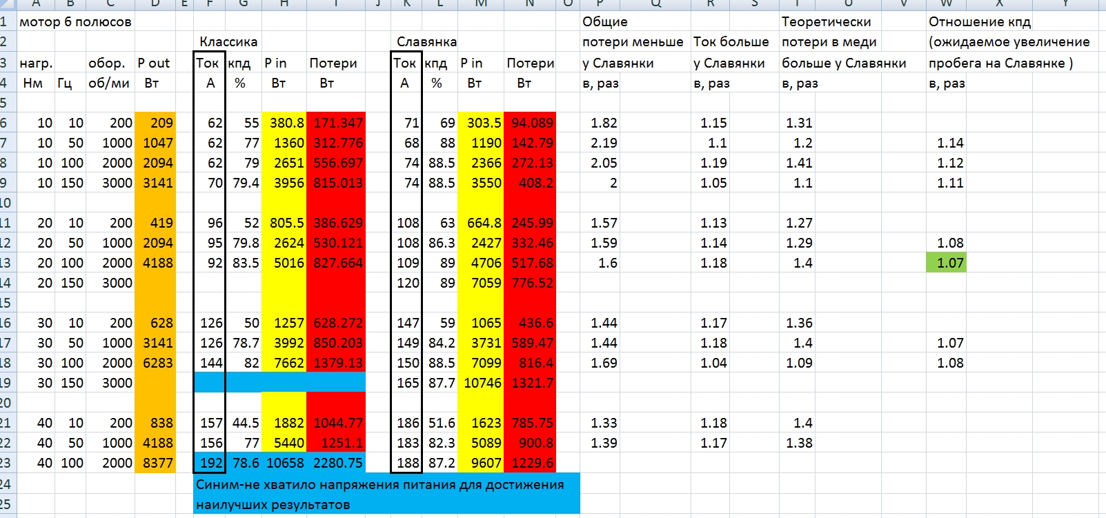Как-то странно, у славянки ток получился больше а потери меньше, видимо у Славянки витков меньше моталось (поэтому для классики нехватило напряжения питания для больших оборотов).