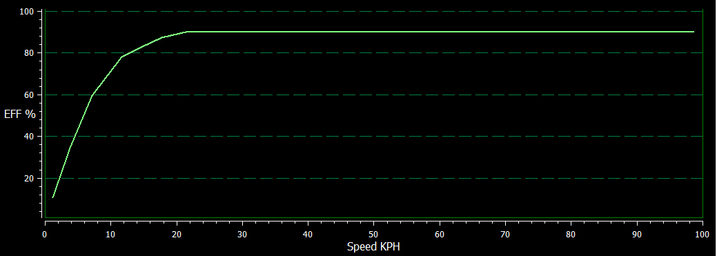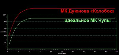 Здесь видно что на скорости 20 кмч КПД всего 56 процентов. То есть это очень фиговый кпд. В этом случае выгоднее поехать быстрее и не тошнить , потому что во первых приедешь быстрее , во вторых проедешь не на много меньше. По графику видно что примерно после 40 кмч начинается полка КПД. Это и есть оптимальная скорость для  этого мотор-колеса.