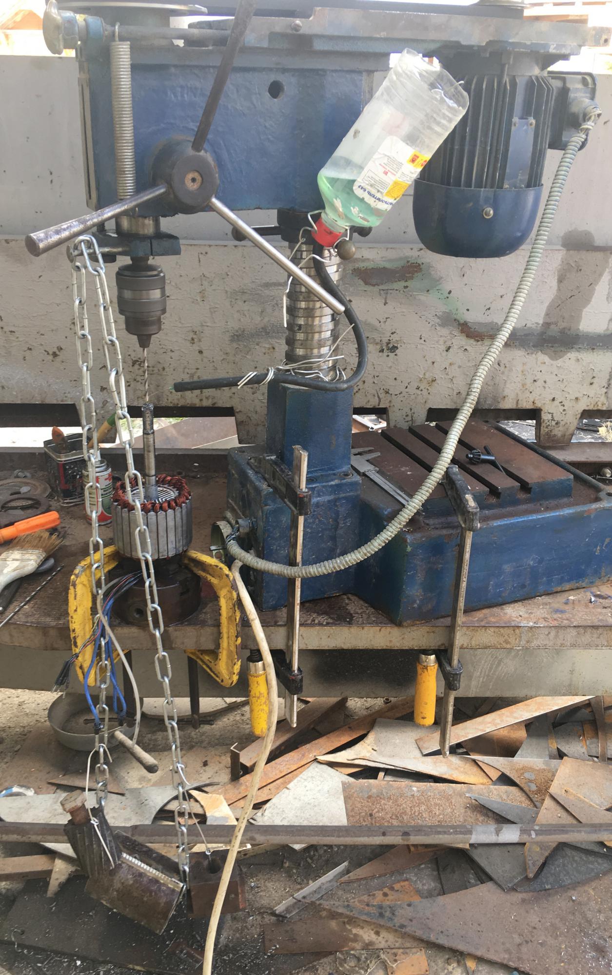 Ещё, я поленился накернить ось и сверло, соскочив, перебило несколько жил намотки статора... Пришлось в четвёртый раз перематывать...