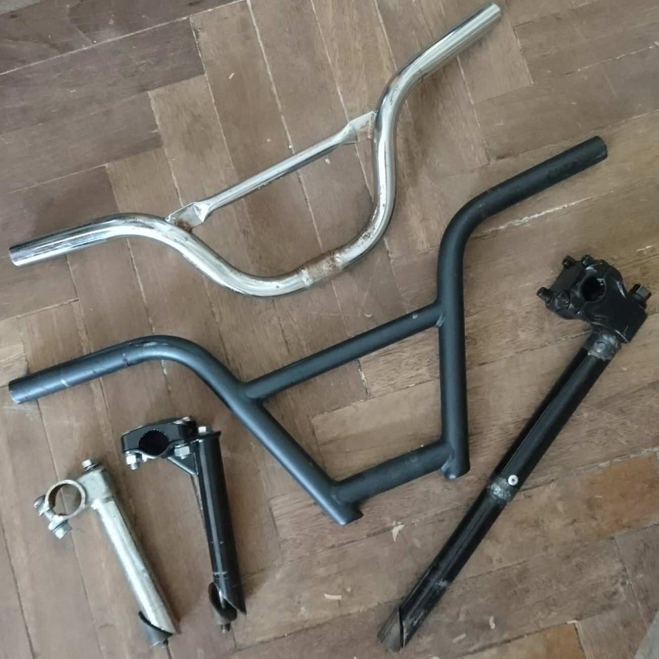 Походу дела, я буду пилить и переваривать старый чёрный руль, когда поеду варить крепежи для суппортов. Кстати, хромированный руль на фото по высоте подходит, но у него плохой выгиб ручек и они коротковаты для всех элементов управления.... Также с выносами целая эпопея, точнее со штырями, у которых нет названия как такового. Как я понял, наиболее правильно это называется "внутренний вынос". Когда была задача протестировать прототип - всё упёрлось в вынос руля, так как не хватало высоты (а складной вынос из Китая ехал около месяца) и я решил надставить стоковый вынос (который оказался по факту самым классным) и теперь этой длинны много, из-за надставки вынос не утопить, как нужно...