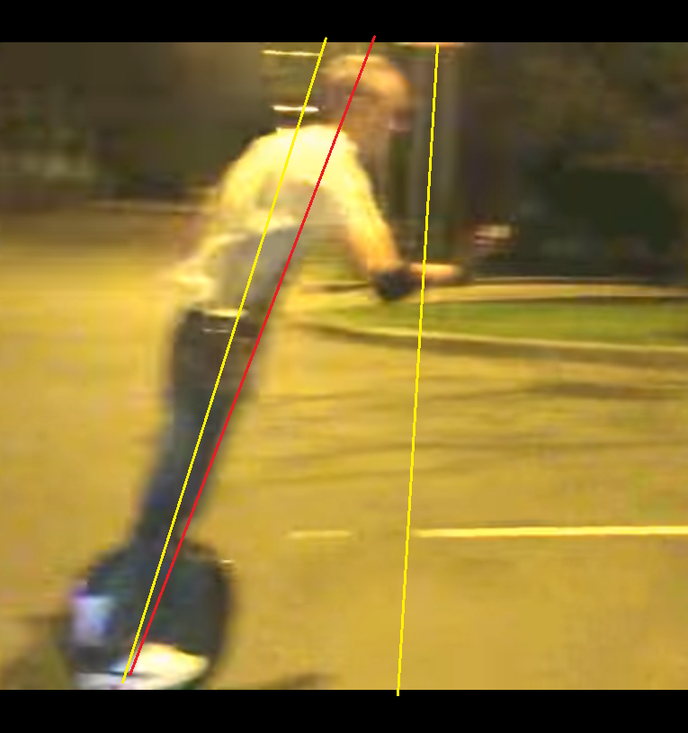 Желтые линии - наклон Дэна и что-то вертикальное на фоне, два столба или дерева.