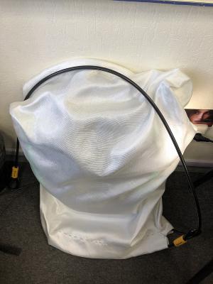 В принципе сделан по рецепту Dr.Fresh (спасибо еще раз), но добавил еще трос снизу. Идея в том, чтобы вытаскивать горящее (не дай Бог) колесо за конец троса в коридор/на пожарный балкон. Трос сделан петлей внизу, должен сам подзатянуть низ мешка при вытаскивании. Я вот сомневаюсь только, выдержат ли скрепочки такое таскание. Возможно внизу надо усилить чем-то.