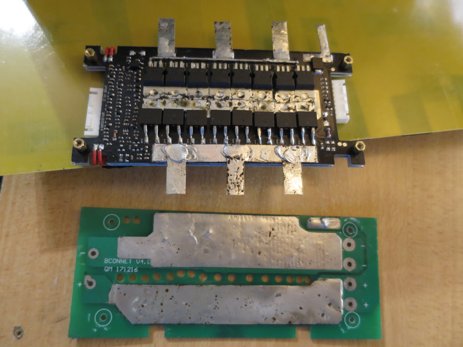 Проверил феты мультиметром, два из 6ти, которые со стороны силовых проводов звенят... Заменил их, выпаяв пару из переднего неиспользуемого контроллера. Колесо стало крутиться