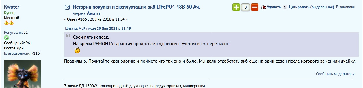 Цитата: Kwoter от 31 Март 2018 в 10:37Писать в этой теме вообще ответы желания не возникает - сразу набегают диванные эксперты и делают однозначные выводы - бмс неисправна, батарея собрана криво, ячейки заранее брак. Бездоказательно! Это тролли и их кормить желания нет, соответственно и писать смысла нет.