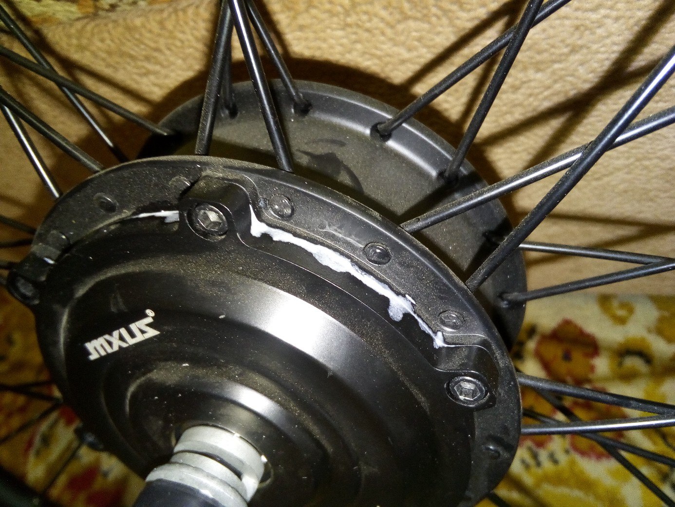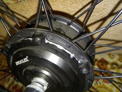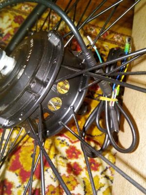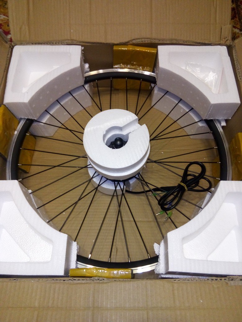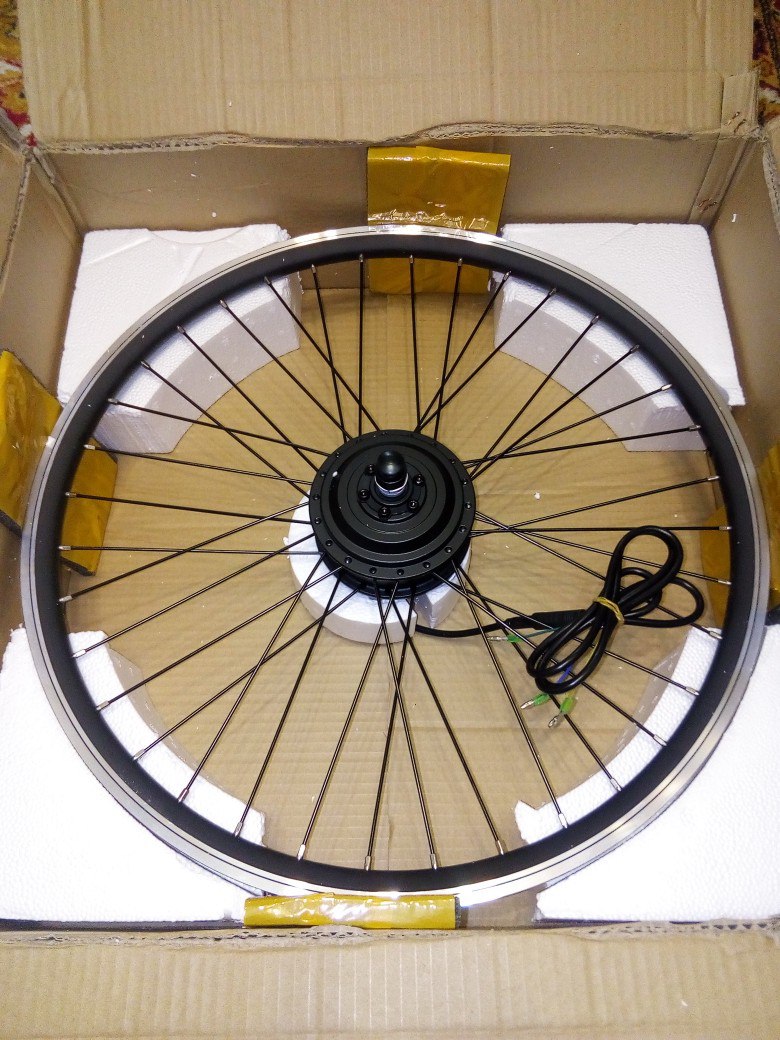 Посылка шла ко мне целый месяц. Пришла без повреждений, сборка на вид нормальная. Спицы толстые - 2,5 мм. Обод на вид достаточно узкий - 2,5 см. Масса всего мотор-колеса 3,7 кг.