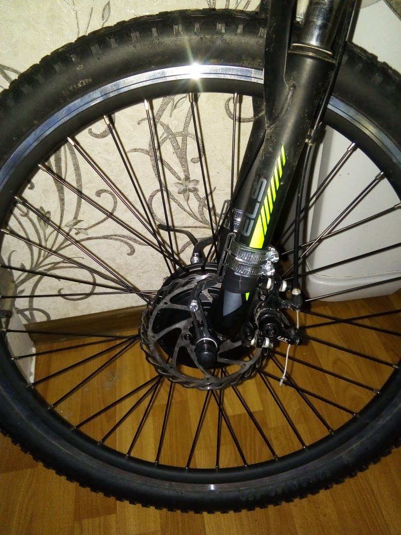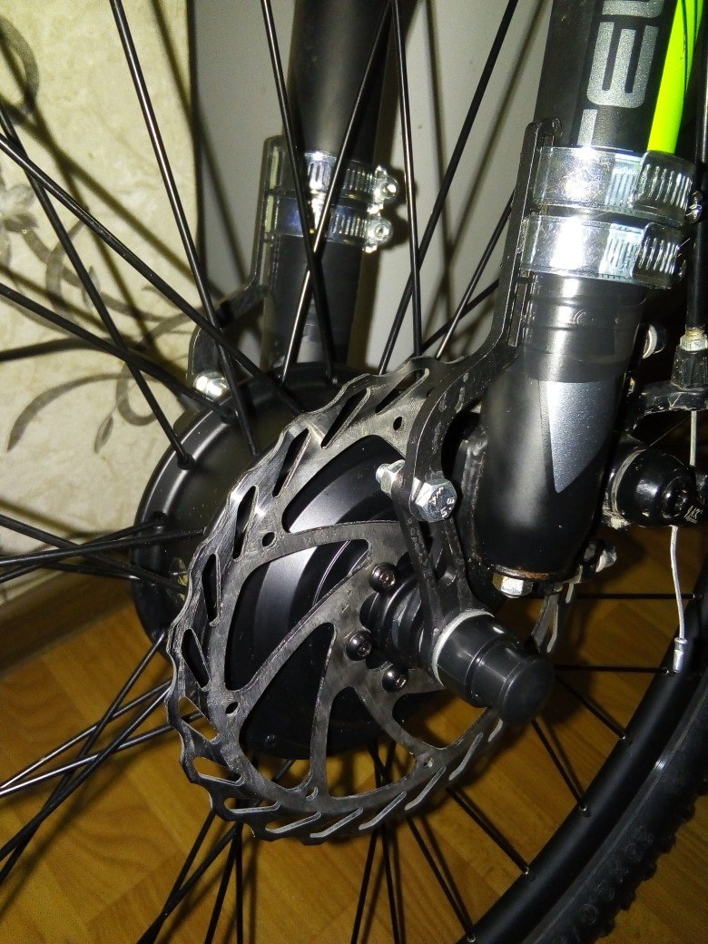Установил мотор-колесо на своё место, закрепил дропаутами. Колесо встало без каких-либо проблем, лишь прокладку под тормозной диск убрал с движка, так как диск немного терся об колодку.