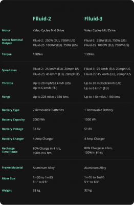 Новые электровелосипеды Flluid-2 и Flluid-3 оснащаются инновационной системой среднего привода Valeo. Они вырабатывают 750 Вт и 130 Нм крутящего момента. Система также состоит из автоматической коробки передач с 450%-ным коэффициентом. Помимо этого, предусмотрена возможность переключения передач вручную.