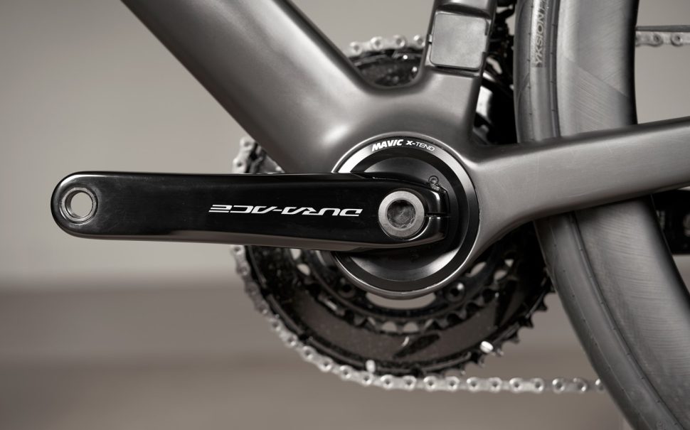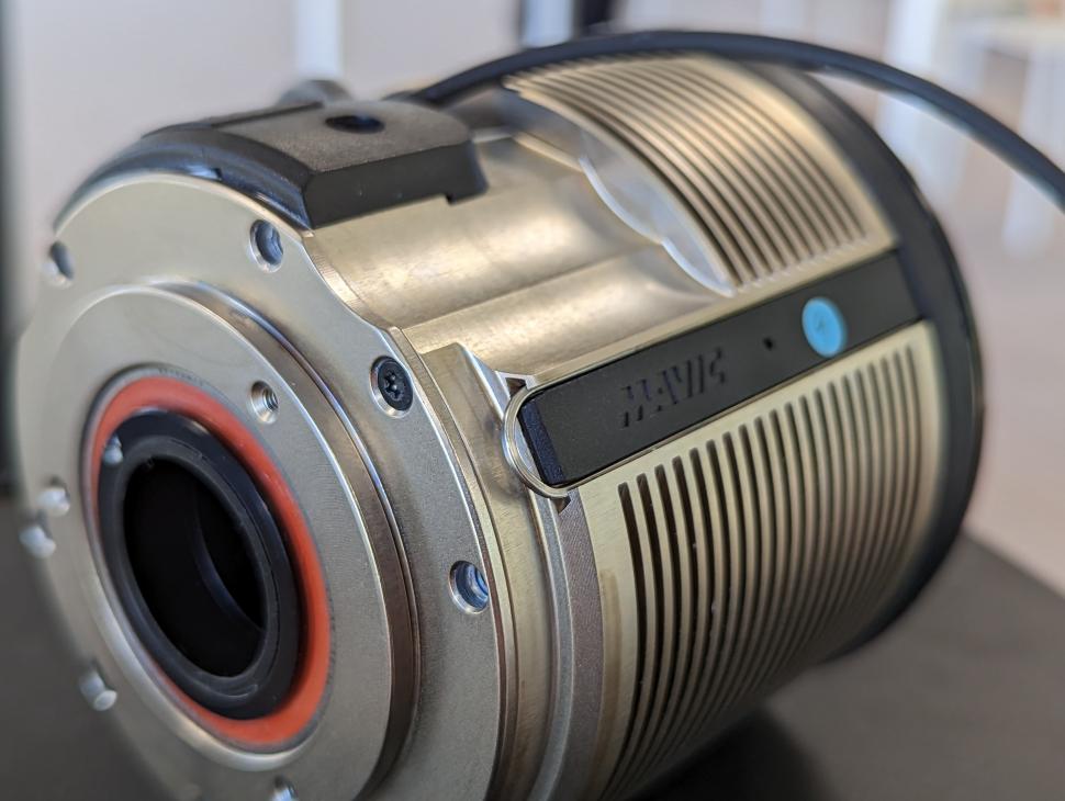 Для тестов Mavic сотрудничали с BMC, которые изготовили им рамы под нужные размеры мотора. на моторе почти по все поверхности корпуса имеются рёбра охлаждения, которые можно оставить открытыми под кареткой или сзади, в районе перьев.