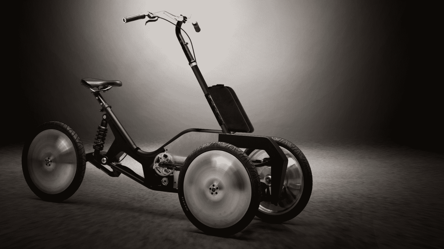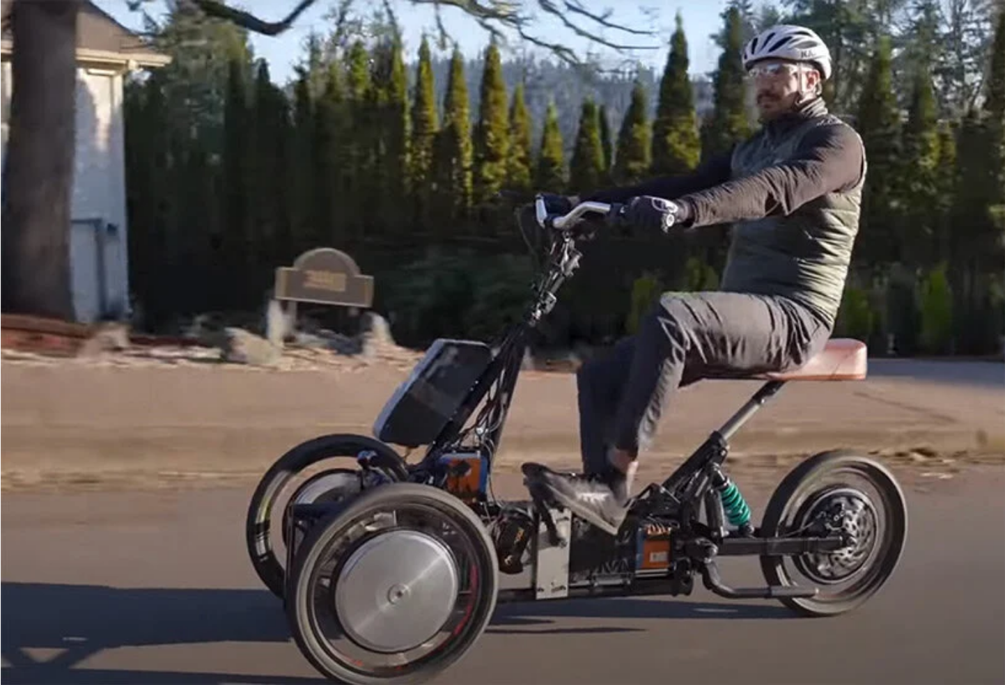 - создатель трехколесного FUV (Fun Utility Vehicle), бросается в бой на электрическом трехколесном велосипеде. То есть, когда вы поворачиваете, велосипед наклоняется, чтобы удерживать все три колеса на земле, чтобы предложить ощущения от вождения, близкие к двухколесным, но с устойчивостью трех колес. Это называется MLM, от «Mean Lean Machine».