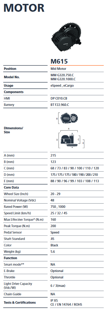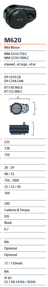 Шатуны крепятся к валу мотора по стандарту ISIS. У этой модели снижен Q-фактор размещения шатунов, что положительно сказывается на КПД самого велосипедиста, так и на здоровье его коленей. Такие моторы (0,25 кВт) используются больше для поддержки педалирования, а не езды только на электротяге. Поддерживает каденс (частота вращения педалей велосипедистом) до 120 об/мин и скорость до 45 км/ч.