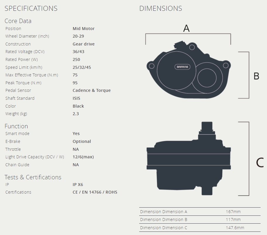 Центральный мотор выполнен в металлическом корпусе из магниевого сплава (этим обусловлен небольшой вес). Такой корпус хорошо отводит тепло от контроллера и не боится коррозии. Защита от воды по стандарту IP X6. Монтируется двигатель на три крепежных винта в специально предназначенную раму (о совместимости с другими моделями пока не заявлено).