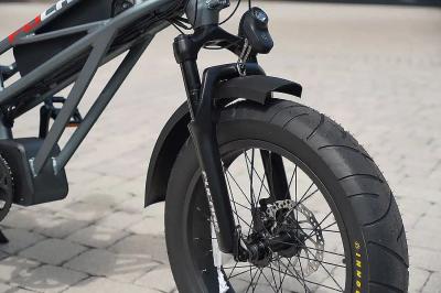 Для обеспечения безопасности байк оснащен гидравлическими дисковыми тормозами, не требующими обслуживания. На колесных дисках диаметром 20 дюймов использованы шины шириной 10 см, что обеспечивает хорошую проходимость на разных поверхностях, устойчивость и маневренность.