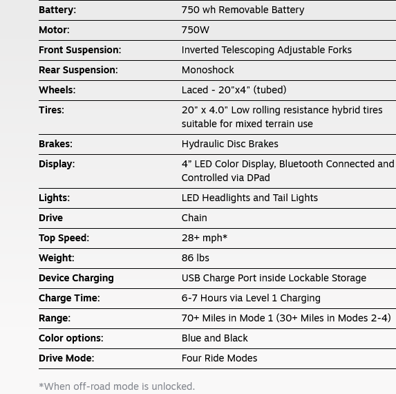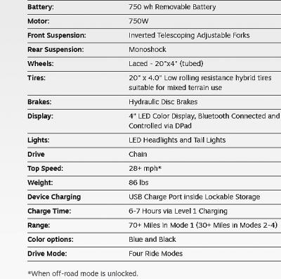 Brat предусматривает четыре режима езды, что позволяет использовать его как на бездорожье, так и для плавного перемещения в городских условиях. Настройки варьируются от едва заметной помощи в кручении педалей до полного привода. Заявленный запас хода Brat составляет 112 км без подзарядки. Для полной зарядки 48-вольтовой батареи Brat от обычной домашней розетки потребуется шесть-семь часов. Максимальная скорость электровелосипеда составляет 45 км/ч, а электромотор с высоким крутящим моментом обеспечивает достаточную мощность для продолжительных подъёмов и ускорения.