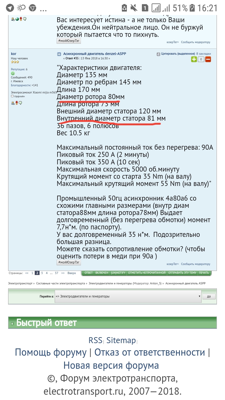 Я эти цифры скопировал с первой страницы этой темы, когда они еще там были, потом их удалили (почему не знаю). Хорошо бы в шапку темы вписать все эти правильные размеры разных вариантов моторов, полюсность, сопротивление, хотелось бы еще количество пазов статора и количество активных проводников в пазу.
