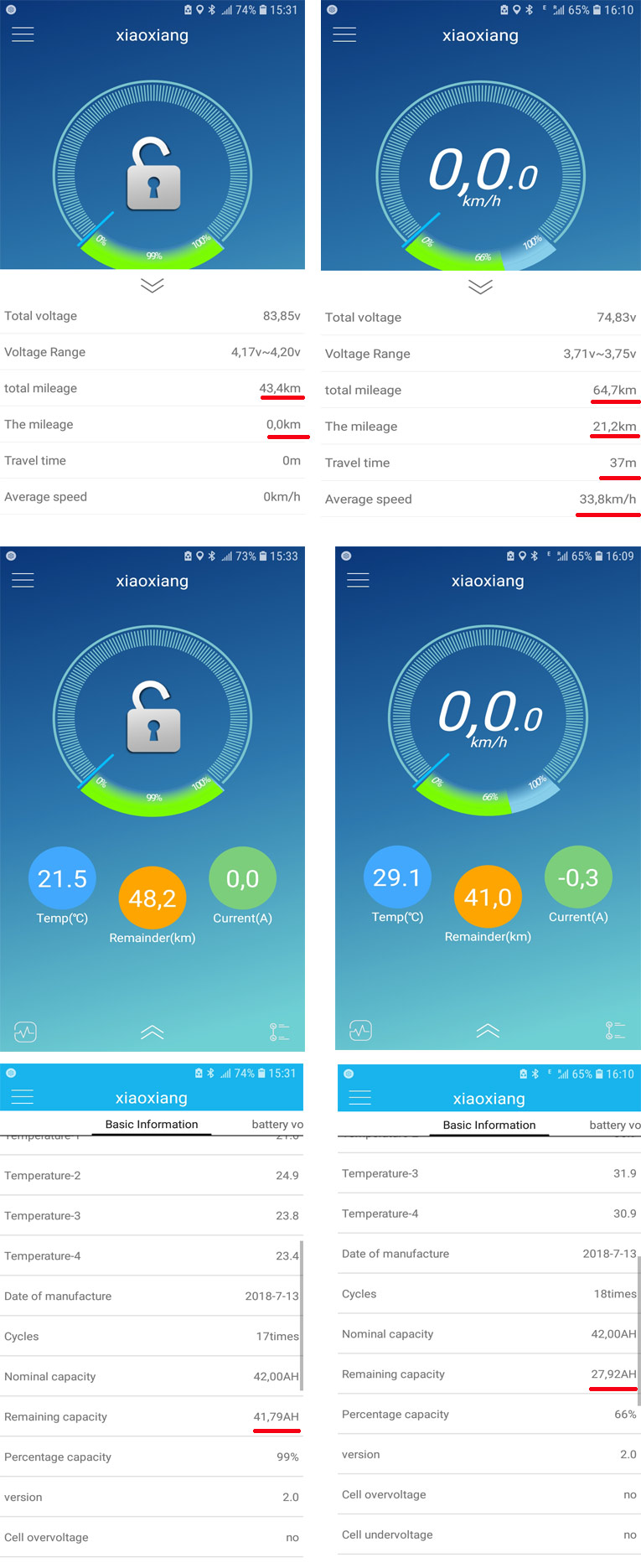 Полный заряд батареея меньше показала на 1% и после поездки на 1 % больше осталось. Растояние которое в начале поездки практически сохранялось до конца. Только последние км начало падать.
