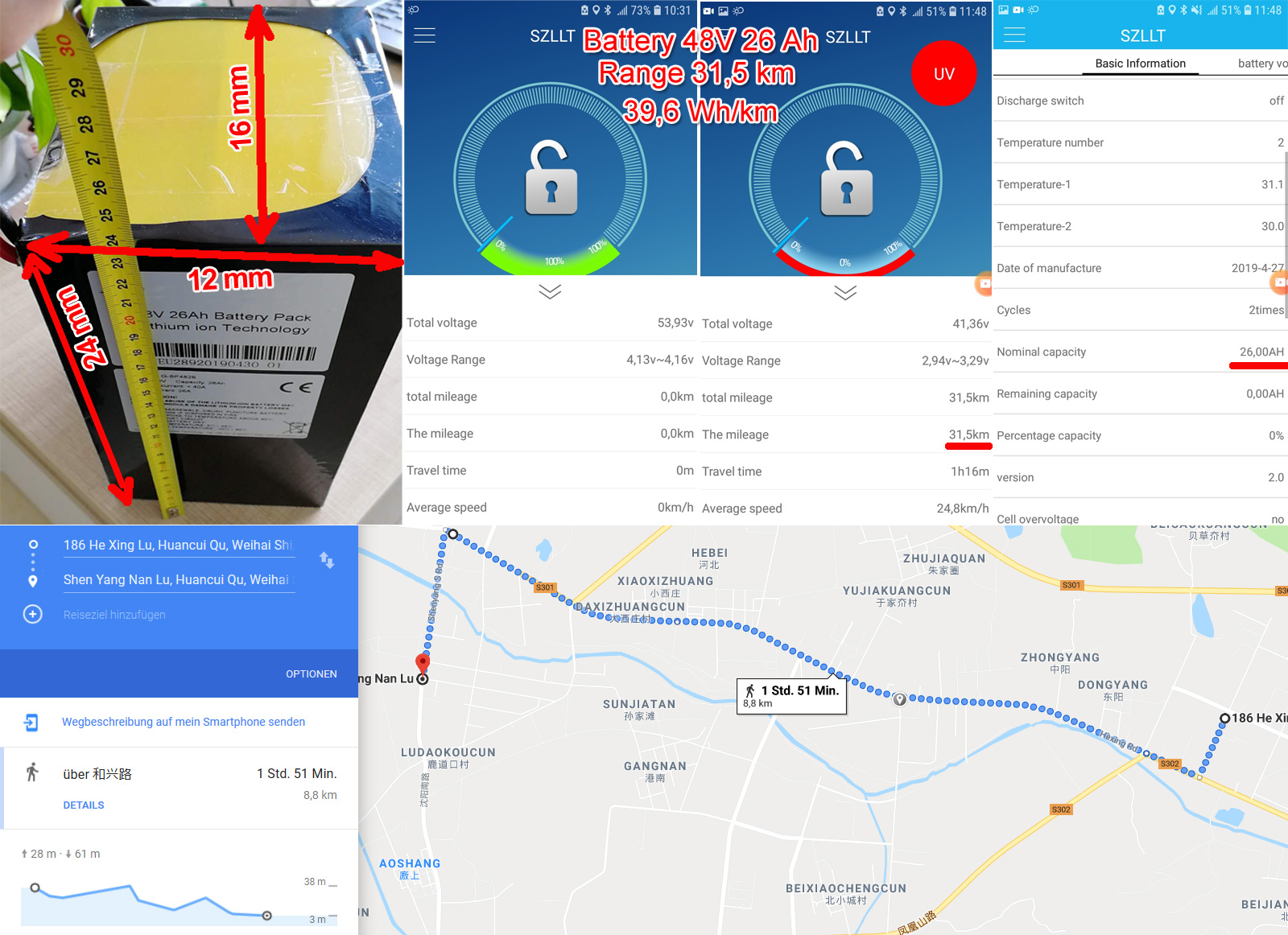 Максимальная скорость составила 94,4 км/ч. Мне удавалось разогнать в Вэйхае до 87,4 с этой батареей. На идеально ровной дороге, скорость больше.