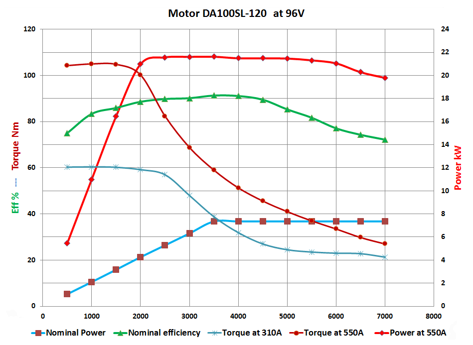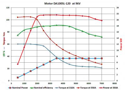 И что даже самый КПДшный электро байк, (если его теоретически разогнать на скорость 100 км/ч ) потребует от мотора не менее 7,5-8 кВт мощности, а с батареи не менее 9 кВт. А мотоцикл или автомобиль с такой редукцией и с такими моментами на заднем колесе превратится в ползающую черепаху. Хотя авто, если попадётся горочка с 1%  то вы не стронитесь с места с 1,5 редукцией.  (не тестил на такой редукции, но знаю, что происходит при 1:4) Моторы практически мало отличаются по моменту, если заметили. Только по номинальной и максимальной мощности. У ДА90С при 350А -момент 75 Нм Дальнейшее увеличение тока не даёт пропорционального эффекта. Для ДА100СЛ возможно и до 700А на пару секунд вогнать. Нужно лишь хорошее охлаждение для таких токов.