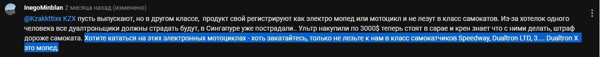 @InegoMinblan я запутался??? Покупать по документам как мопед? Вы точно в этом мире проживаете? Просто в этом мире Dualtron X это электросамокат и никаких документов на него не требуется. Это именно ваши фантазии и желания, чтобы X проходил по каким-либо документам и регистрировался минимоторс как мопед. Это именно Вы это писали в сообщениях выше. Я же со своей стороны уже сколько раз высказался - задолбали называть екат мопедом или мотоциклом, не лезте в эту тему, если для вас рациональнее купить ДВС технику впятеро дешевле. Оставьте свое мнение при себе и просто игнорируйте этот екат. Вы все равно ничего не измените. Этот екат будет продаваться как екат, потому что это екат. Точка...