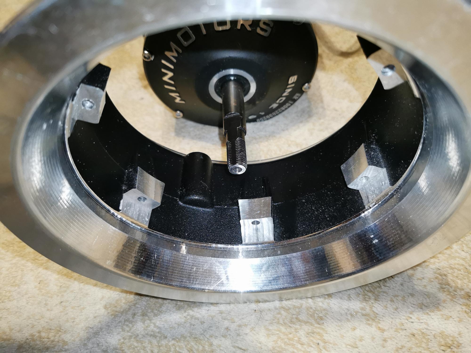 желтый мотор имеет большой разбаланс. зажал его в тески (станочные), которые стояли на ковре, то есть не жестко, при раскручивании тиски начинает качать, на малой скорости по отражению люстры от зеркальной поверхности тисков хорошо видно амплитуду раскачивания, разметил колесо маркером и затем подставляя грузики прижимая их мягкой прокладкой в распор и раскручивания, стал искать то положение где меньше всего расколбас, грузиков 3 шт , один напротив соска и два с одной стороны , слева и справа.(ПЕРЕД БАЛАНСИРОВКОЙ ПОДБИРАЛ ПОЛОЖЕНИЕ КРЫШКИ МОТОРА, шесть вариантов, нашел с меньшими вибрациями )  Полностью конечно не удалось убрать, но уменьшил до безопасного использования колеса. Шайбы для желтого пришлось изготовить из более тонкого металла ( пластины от жесткого диска подошли идеально по толщине) Тормоза встали идеально на оба колеса. гидролинию заднего провел по наружи, подвесив на кембриках под складкой деки, то есть шланг имеет не жесткое крепление, что позволяет сдвигаться при работе задней подвески.