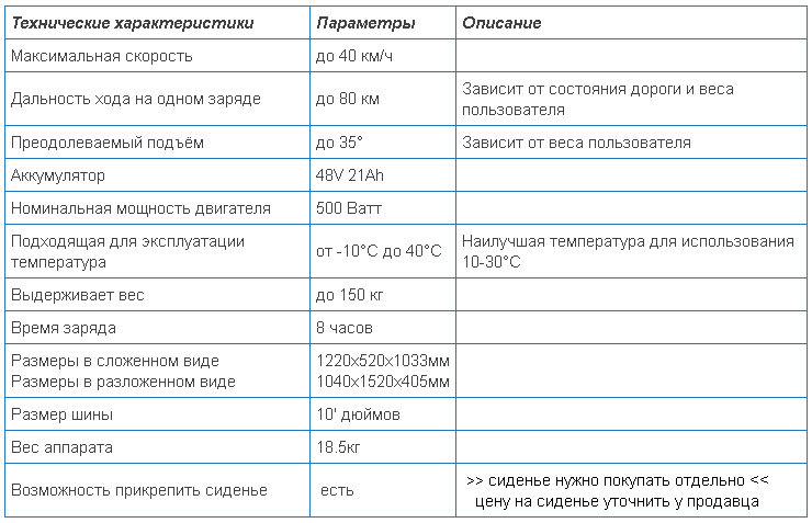 Мотор мощностью в 500 Ватт заднеприводный. Максимальная скорость до 40 км/ч. Мощная батарея ёмкостью 21 Ач напряжением 48 V, выдает 1008Wh, что позволит проехать на одном заряде до 80 км. Зависит от веса пилота и участка дороги. Время полного заряда 8 часов.