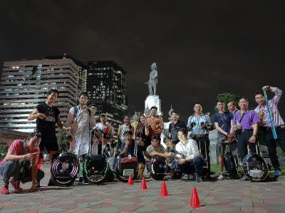 Первый MSuper X появился и в Таиланде, тоже сегодня имел возможность прокатиться на нем. У меня такое ощущение, что из-за того, что я начал кататься на моноколесах всего 2 месяца назад и моим первым колесом было KingSong KS-16S, тогда как большая часть участников форума начинали на год-два-три раньше на гораздо менее мощных и более легких колесах, мое восприятие и впечатления от разных колес сильно отличаются от впечатлений большинства. Имейте это ввиду. В общем, меня MSuper X поразило своей впечатляющей маневренностью и небольшими размерами. Живущие в России меня вряд ли поймут, но для Бангкока это наверное лучшее городское колесо на сегодняшний день. Разумеется, под маневренностью и небольшими размерами я не имею ввиду что оно вертится лучше чем Inmotion V8 или занимает меньше места чем MCM5. Но тут буквально несколько страниц назад шло обсуждение, что на покрышке толщиной 3 дюйма и диаметром в 19 дюймов, мол, вообще рулить будет невозможно.  Так вот вертится колесо лишь немногим хуже чем KS-18L c покрышкой 18x2.5, которое в свою очередь вертится лишь немногим хуже одной из самых популярных моделей прошлого года KS-16S с покрышкой 16x2.15. Я, будучи очень неопытным райдером, на большинстве незнакомых колес чувствую себя очень неуверенно, особенно на поворотах, с Теслы я чуть не упал, например, на старом MSuper V3 я осторожно разворачивался по дуге радиусом метров в 10. MSuper X наряду с MCM5 это первое из опробованных мною колес марки Gotway, на котором я сходу почувствовал себя вполне уверенно и сразу смог сделать "змейку". И никаких особых дополнительных движений для "змейки" на MSuper X делать не потребовалось. Колесо точно также зажимается ногами и управляется ими же как и KS-18L. Что касается габаритов, взгляните на фото с нашей сегодняшней сходки, на переднем плане слева в ряд стоят V10F, KS-18L и MSuper X: