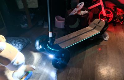 А ну и главный минус 18.5 кг веса - взяться не за что - только за деку. Руль в сложенном состоянии держат тонкие винты и все, к тому же в сложенном состоянии он не фиксируется. Надо придумывать какие нибудь ручки или чехол заказывать. Просто так за руль в разложенном состоянии через бордюры перетаскивается легко.