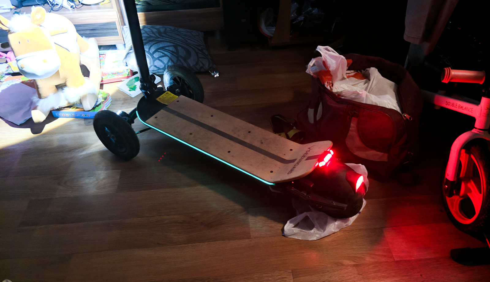Освещение у меня все было. На руль - линзовый фонарь, на переднюю ось по габаритам с каждой стороны на резинке, сзади дополнительный габарит и еще очень удачно светодиодный провод по периметру деки подошел там как раз углубление для этого провода небольшое - прям идеально вышло.