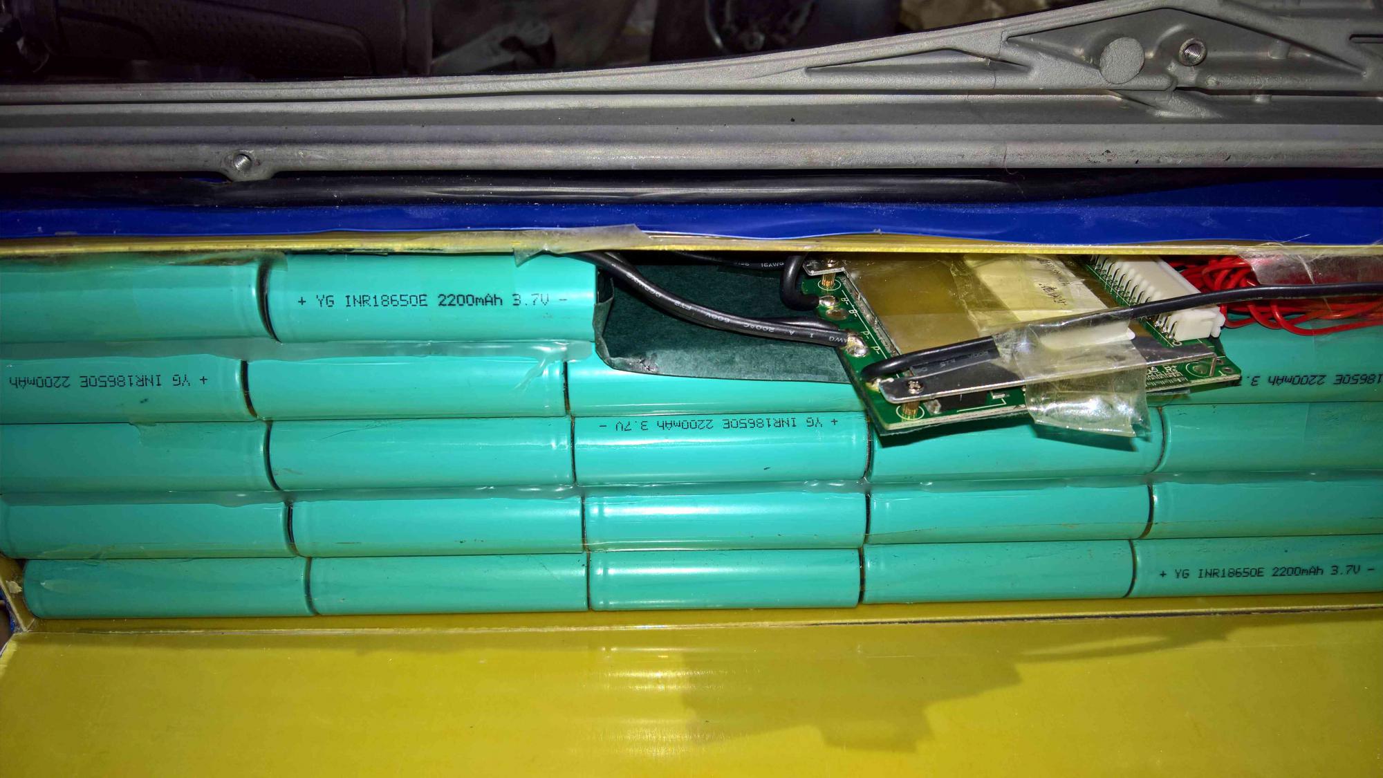 там стоят YG INR 18650 2200. У меня их 78 штук. Это получается 13S6P. БМС есть. Замер внутреннего сопротивления на YR1030 дает примерно 10 мОм, мож чуть меньше по факту т.к. норм замер делается при хорошем контакте с элементами, а я сбоку так подлез. 60 мОм один элемент, я так понимаю.