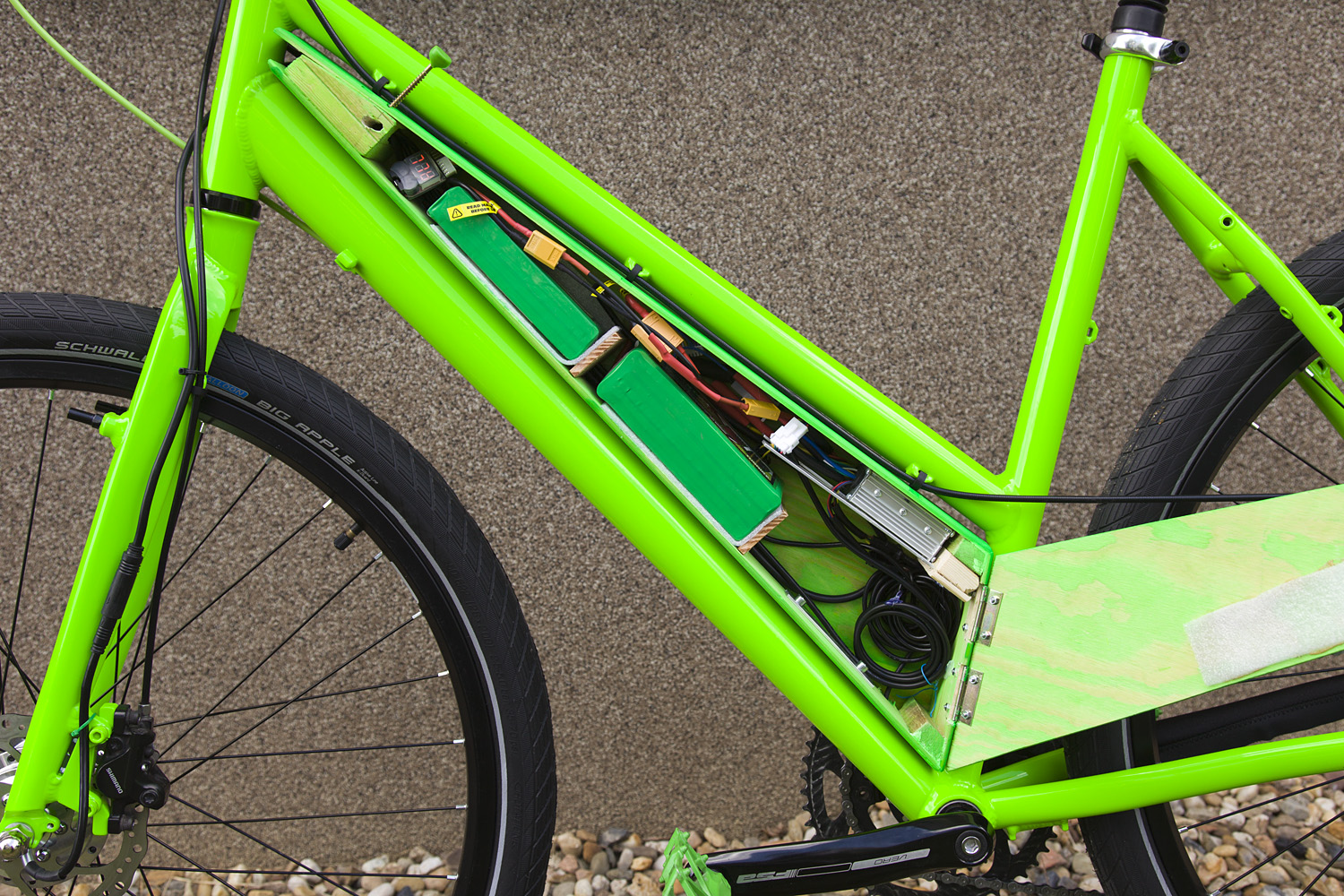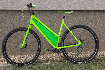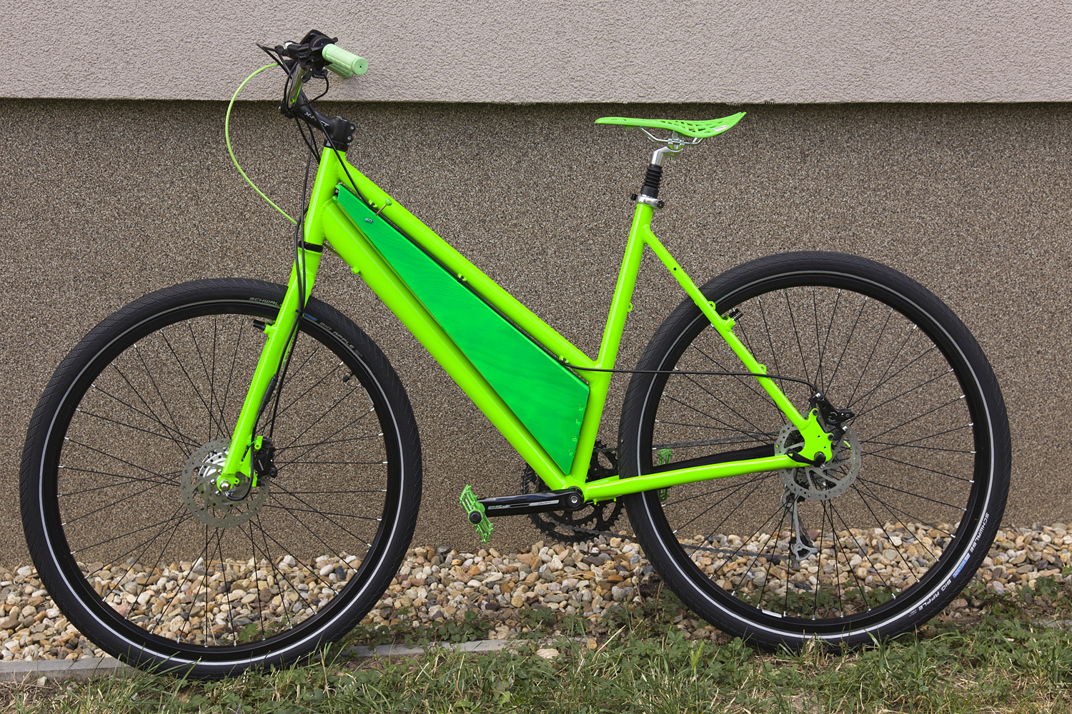 Зеленый велосипед вместе с батарейкой, мотором и 50мм покрышками весит всего 18кг.