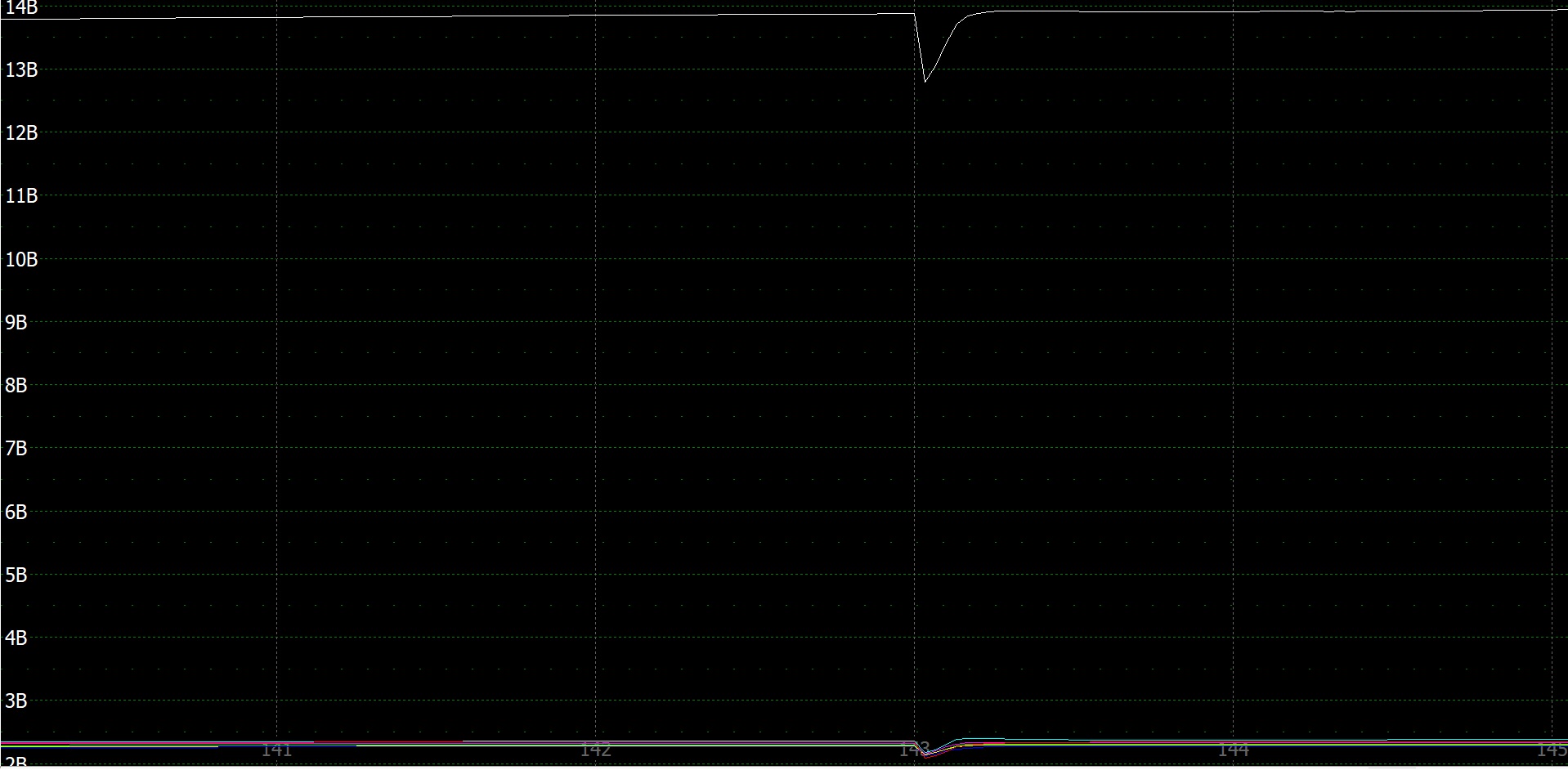 Посему, на глазок (сильно не напрягался), постарался попасть в прежний временной масштаб, впихнул в экранную область график с клемм АКБ (белый) и с таким же масштабом запечатлел баночки.
