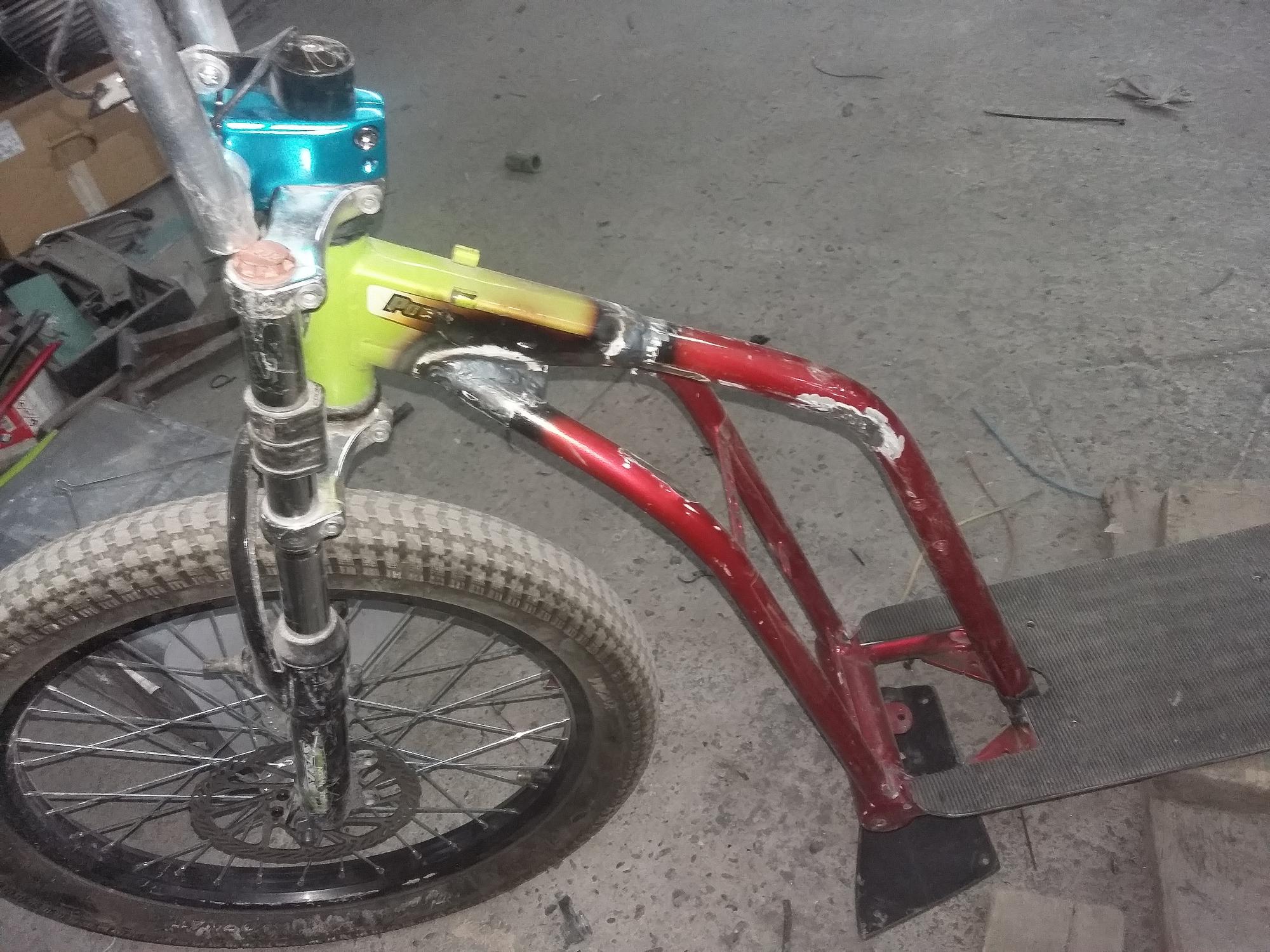 Давно пылилась в углу рама от первой версии моего самоката https://electrotransport.ru/index.php?msg=1068726, и руки чесались его модернизировать, вроде не плох был самокатик, но полное отсутствие амортизации доставляло массу дискомфорта, так как каждая ямка на асфальте прилично отдавала по рукам, и тут как нельзя кстати, товарищ подарил так сказать остатки (рама с вилкой) от подросткового двухподвеса на 20" колёсах.  Вообщем берём раму от старого самоката, отсекаем всё лишнее и добавляем необходимое.