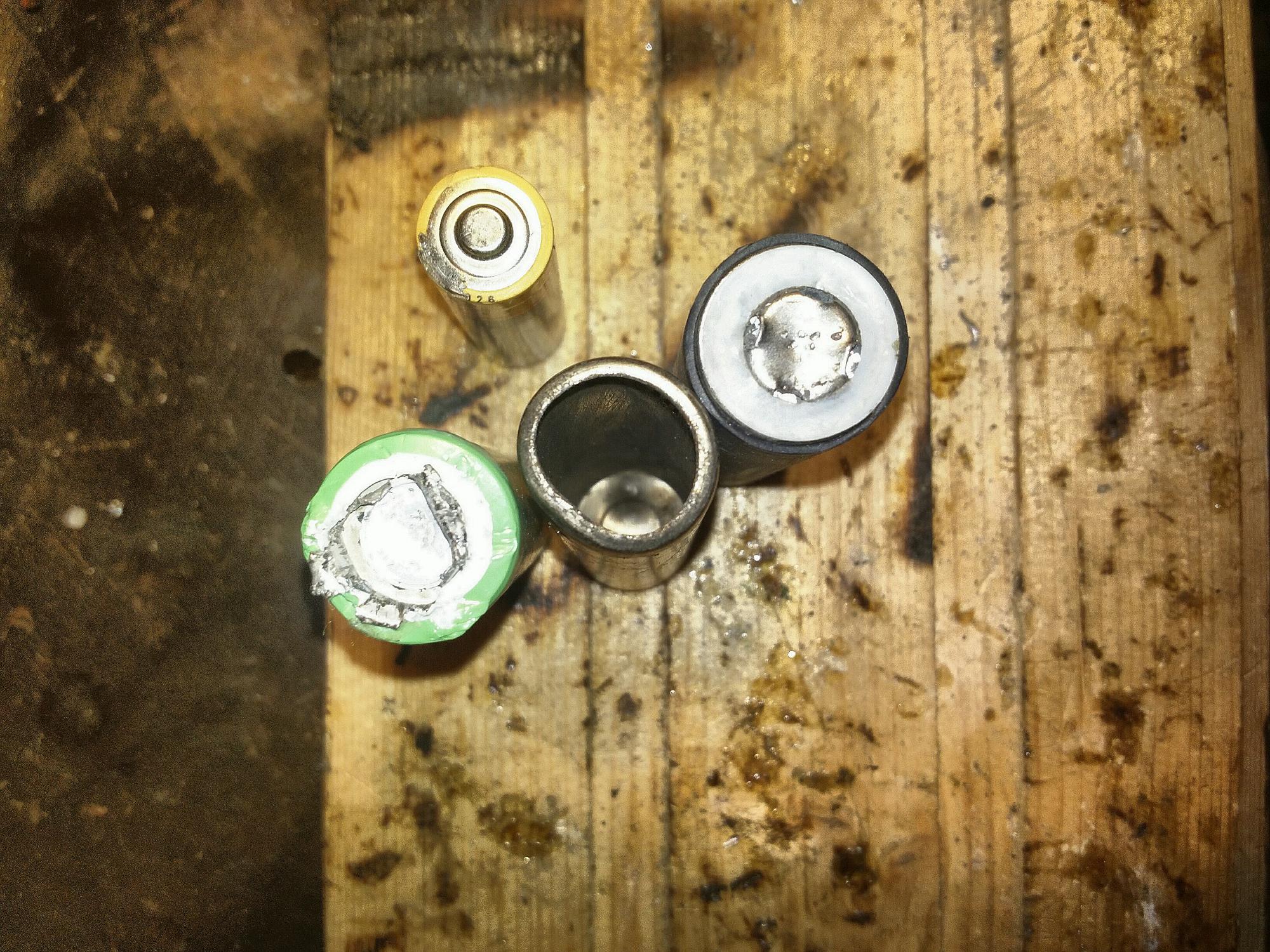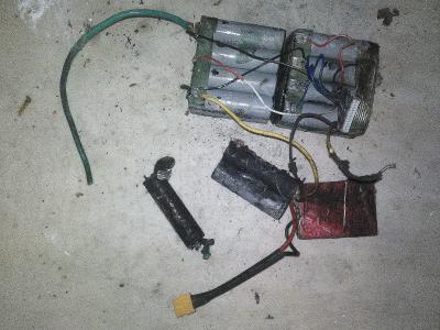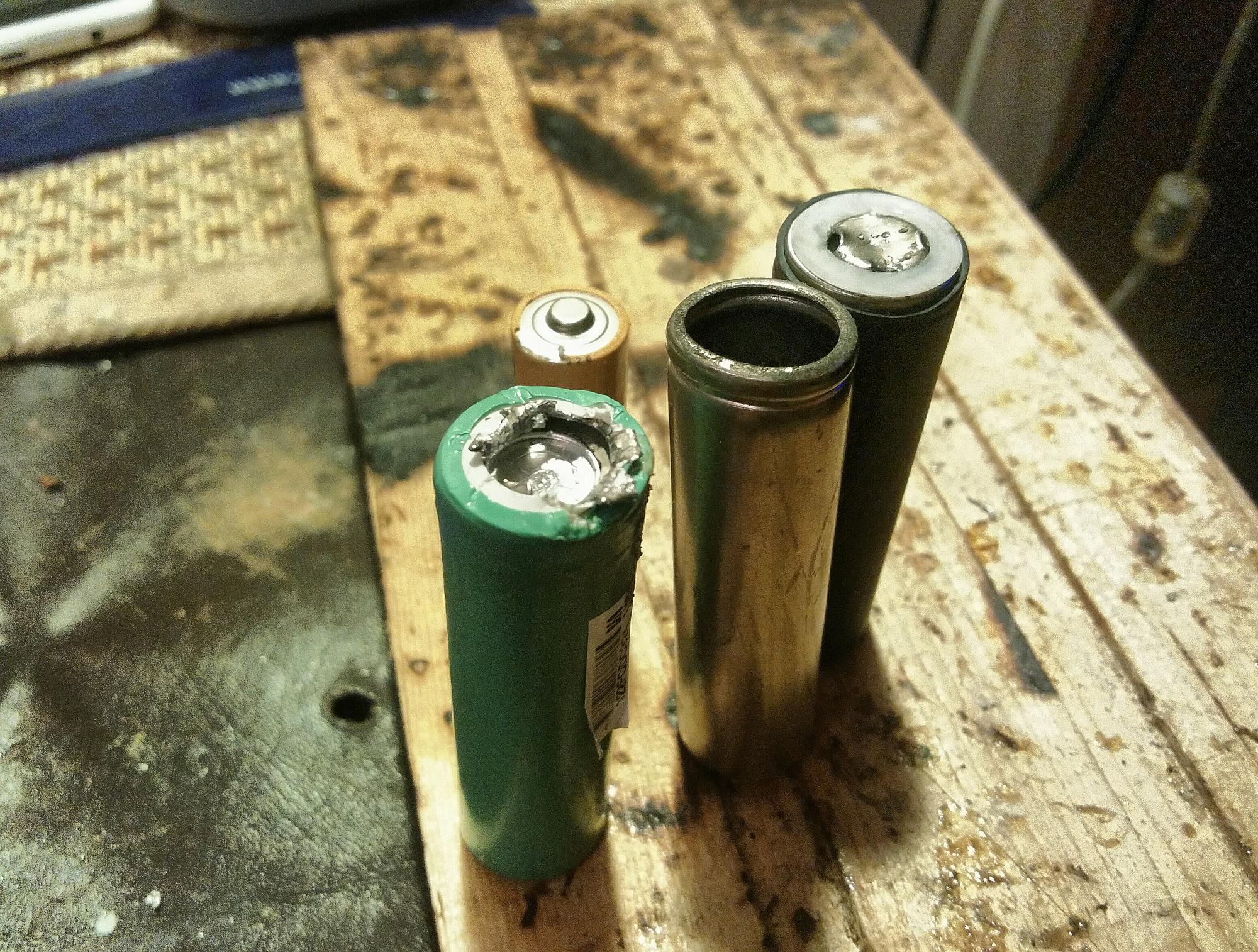 Сборка была 4400 мАч, горбатая, от гироскутера, я с ней экспериментировал, не могу точно назвать, что с ней тогда случилось, она стояла на зарядке, открытая, все провода наружу, по-воздуху, и, по-моему, у нее перемкнуло какие-то из контактов параллельных сборок. Я вообще в другом конце квартиры был, на кухне, услышал шипение, а чайник - выключен. Побежал в комнату - а там она, шипит и дымит, ну я ее за провод и на балкон, и вниз - и через минуту шипения она там внизу сдетонировала. Но не вся, две ячейки. Я ее потом подобрал, от двух ячеек только гильзы остались, еще штук семь совсем мертвые, 0В и никак не оживить, штук пять полудохлые, 500-700 мАч, и штук шесть 1300-1400 мАч.