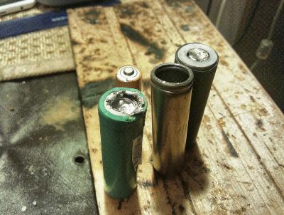 А это - три 18650 и обычная батарейки АА рядом с ними, для масштаба. Одна ячейка - это гильза, то, что осталось после взрыва. Вторая - это тот высокоемкий аккумулятор, который я безуспешно пытался оживить. Третья - это аккумулятор-погорелец, оживленный, убранный в черную термоусадку.