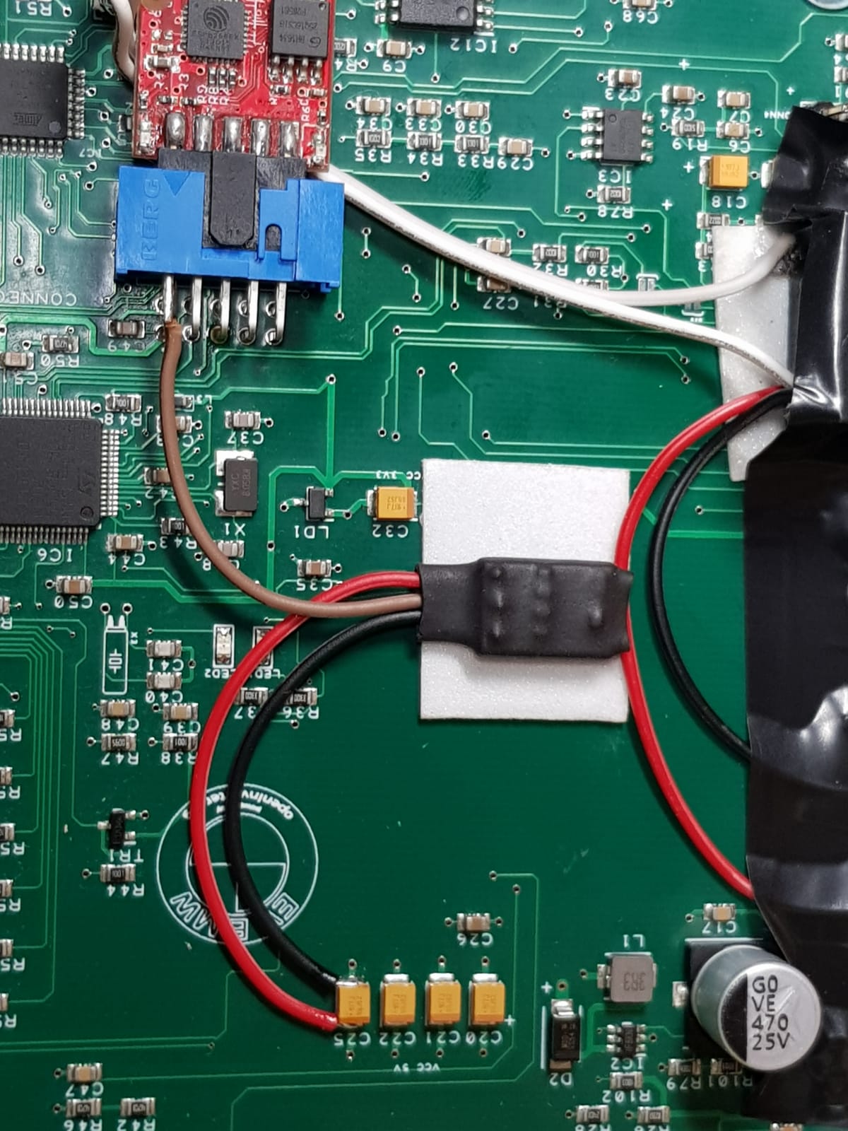Схема подключения видна на фото ниже, 1 вывод на WiFi модуль отрезал от платы и подпаял к нему выход стабилизатора.