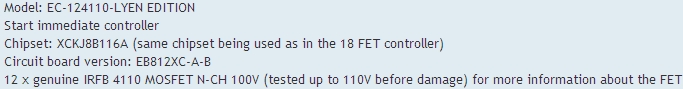 :hello: Добрый вечер всем! Собрался заказывать МК от Пауля такое http://em3ev.com/store/index.php?route=product/product&path=36&product_id=54, но не могу никак определиться с контролером, посоветуйте какой взять, планирую использовать батарею примерно 52V 20Ah, сам склоняюсь к 12 ФЕТ IRFB4110, понимаю что пойдёт любой что у него есть, НО! хочется запас, что-бы не был узким местом, не переделывать его и от перегрузок не умер (мало ли что в последствии прийдёт в голову в смысле эксперименты по увеличению ёмкости и напруги)  ;-D!