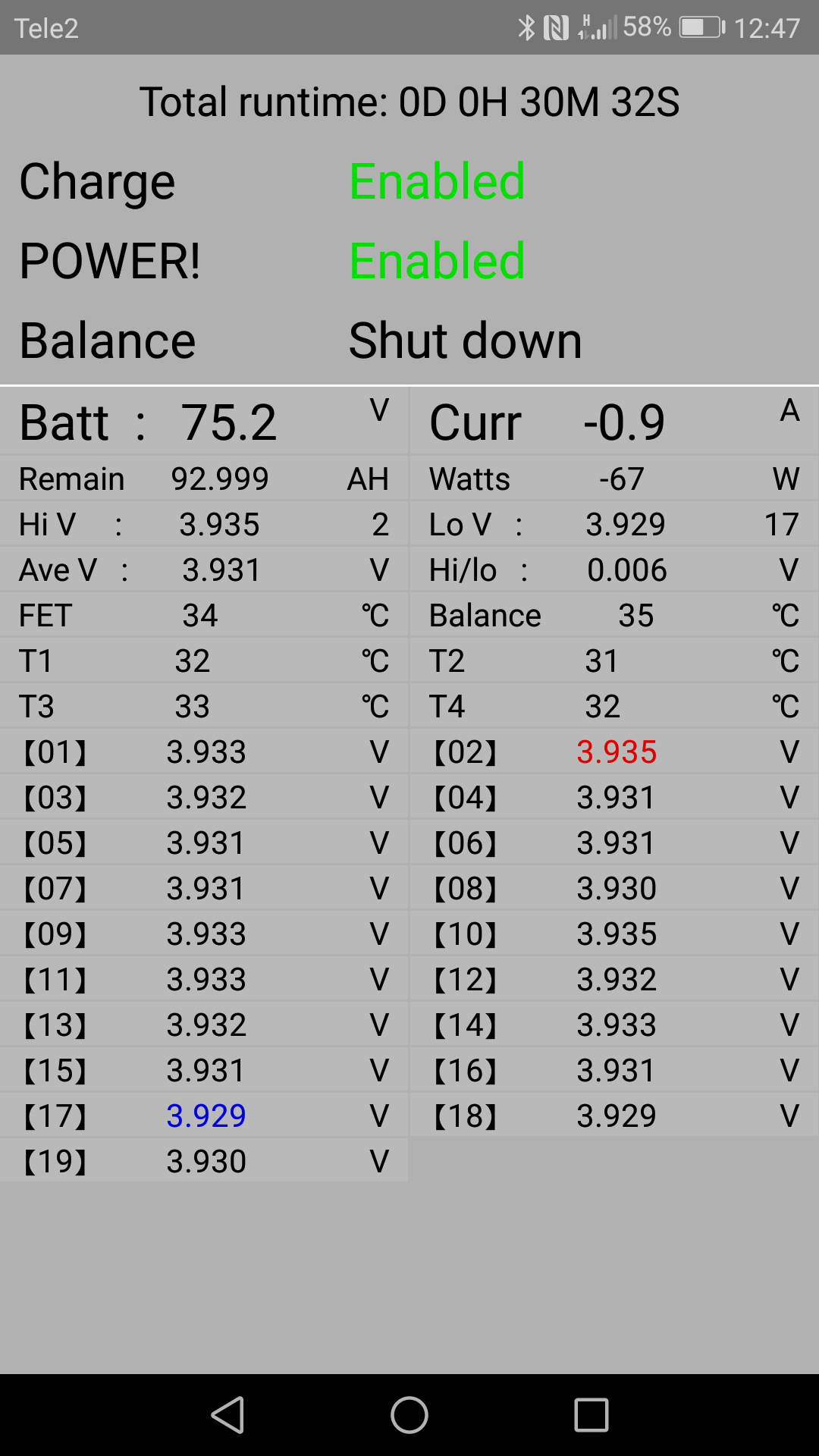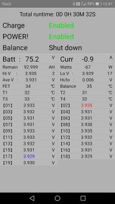 Зарядка регулируемая, на данный момент выставил 80В в холостую. Подсоединил к батарейке показывает 75В. Что касается ячеек то не одна не убегает разбег 0,006В.