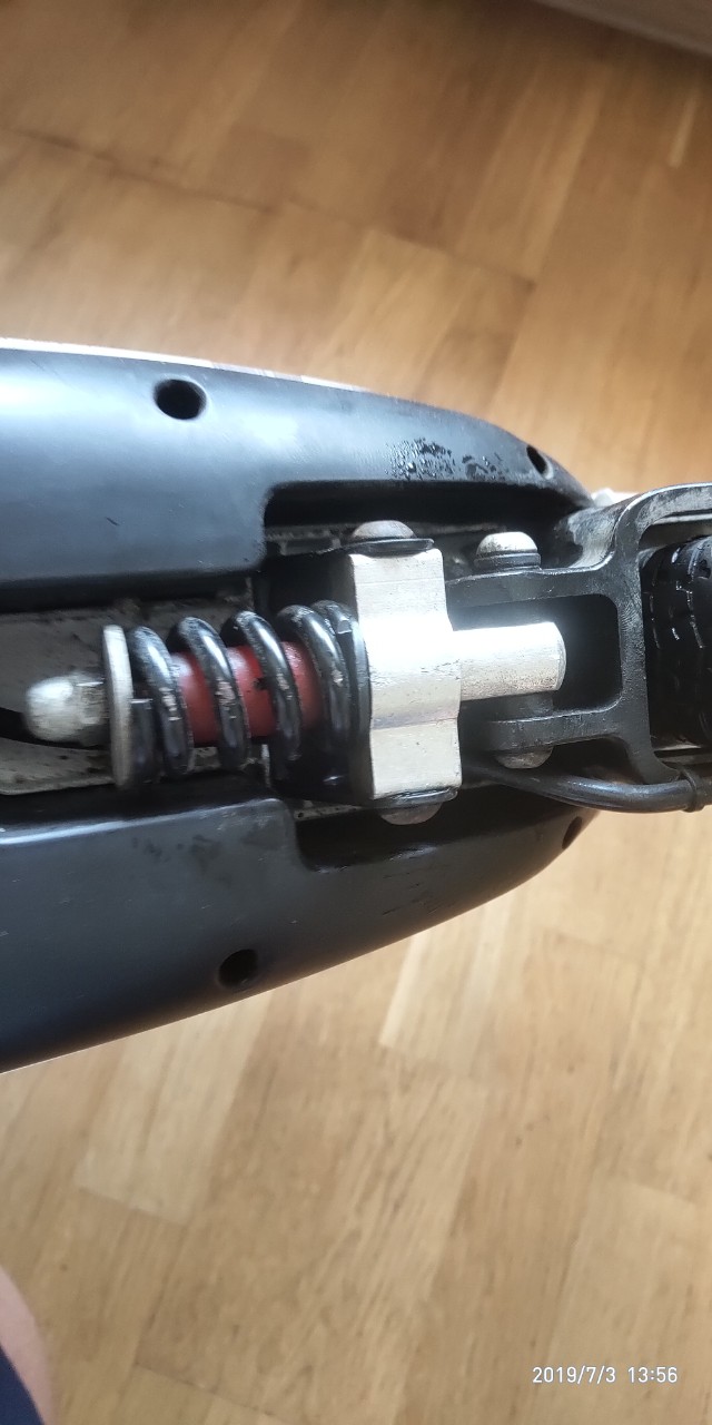 Я  и  пытался отверстия овальными сделать - не вышло  моими  инструментами. Зазор  между пружиной  минимальный, при срабатывании подвески  хоть на полсанитиметра уже будет  касание, зачем там тогда подвеска?  Люфт не  заметил. Сейчас самокат   в  разобранном состоянии,  посмотреть не могу,