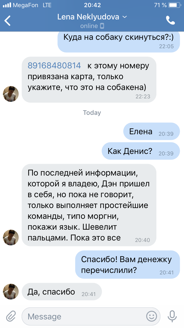 Вчера сделали операцию на бедре, он в сознании, но у него в горле трубка, ещё ряд операций предстоят.Но признак хороший  :-)