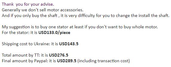 Написал запрос на завод. Пришел ответ что отдельно ось не продается, могут прислать ось вместе со статором, цена соответствующая: