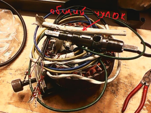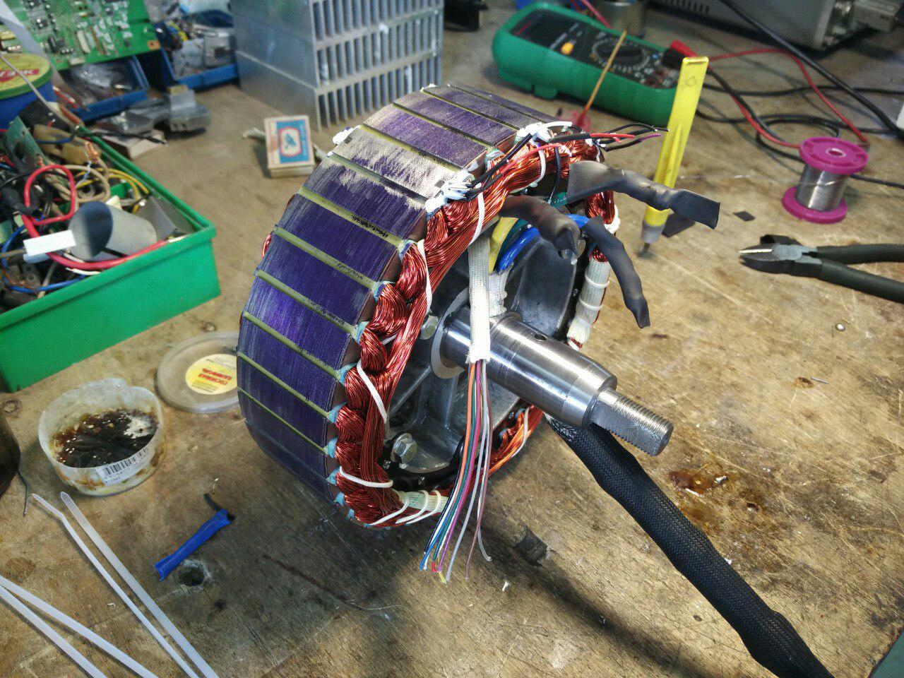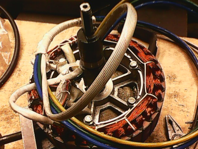 Здесь видно провода идущие к датчикам холла (по три провода к каждому) и видны фазные толстые провода. Они оказались алюминиевыми!  O_O