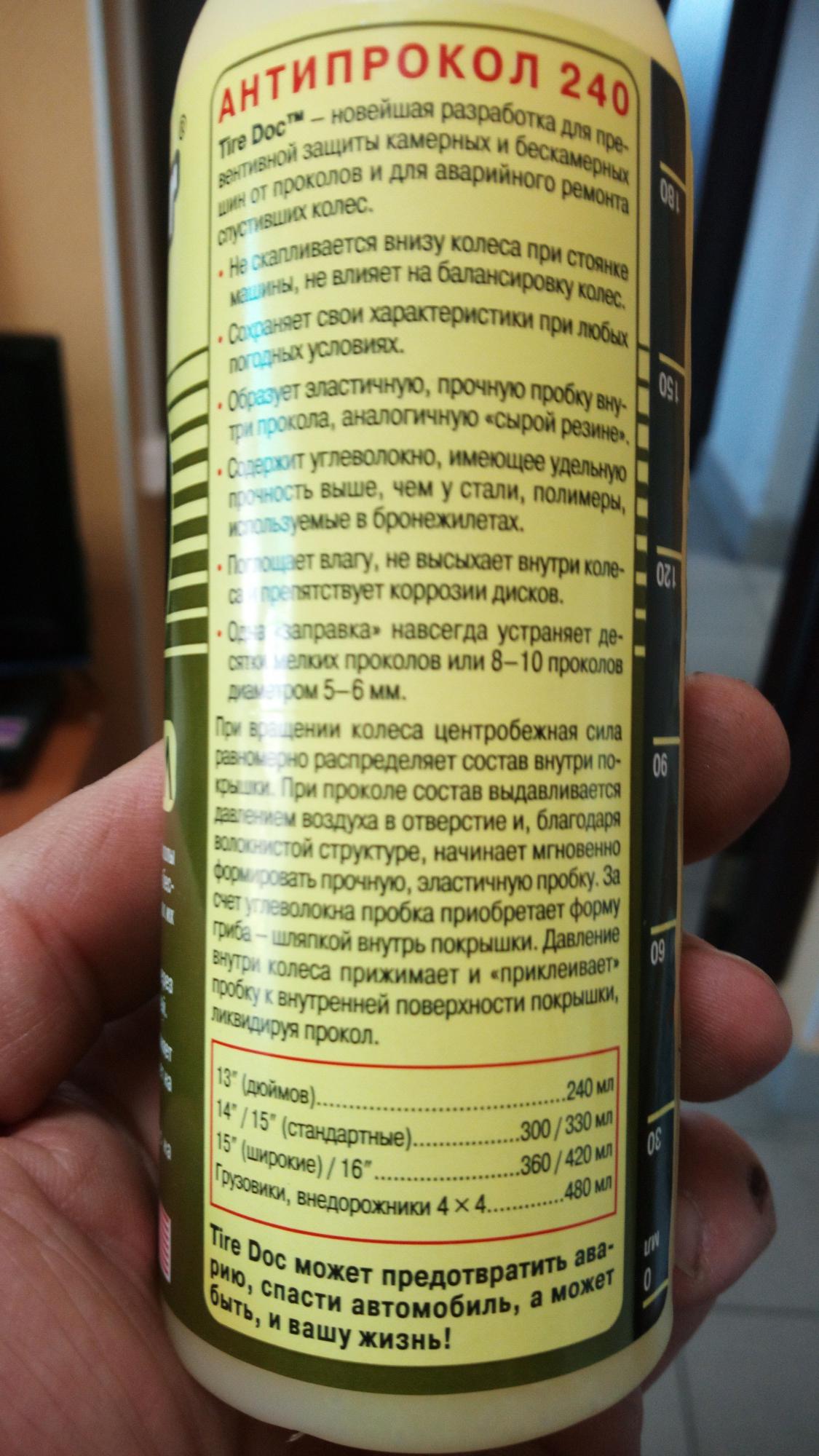 Половина флакона 240 мл на ОБА колеса (примерно по 55 мл в каждую шину).