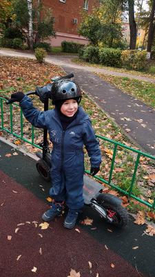 Когда без мелкого катаюсь, то всегда надеваю и наколенники и налокотники, т.к. люблю скорость и адреналин. )) С ребенком еду не выше второй скорости, да и то преимущественно на "пол-шишечки".  Защиту уже не одеваю и вот нашел ей применение. Еще бывает подматываю черное махровое полотенце вокруг пластика налокотника, чтобы сын лицом о вынос руля не ударился при резком торможении. Пластик налокотника конечно не металл рулевого выноса, но все же довольно жесткий...