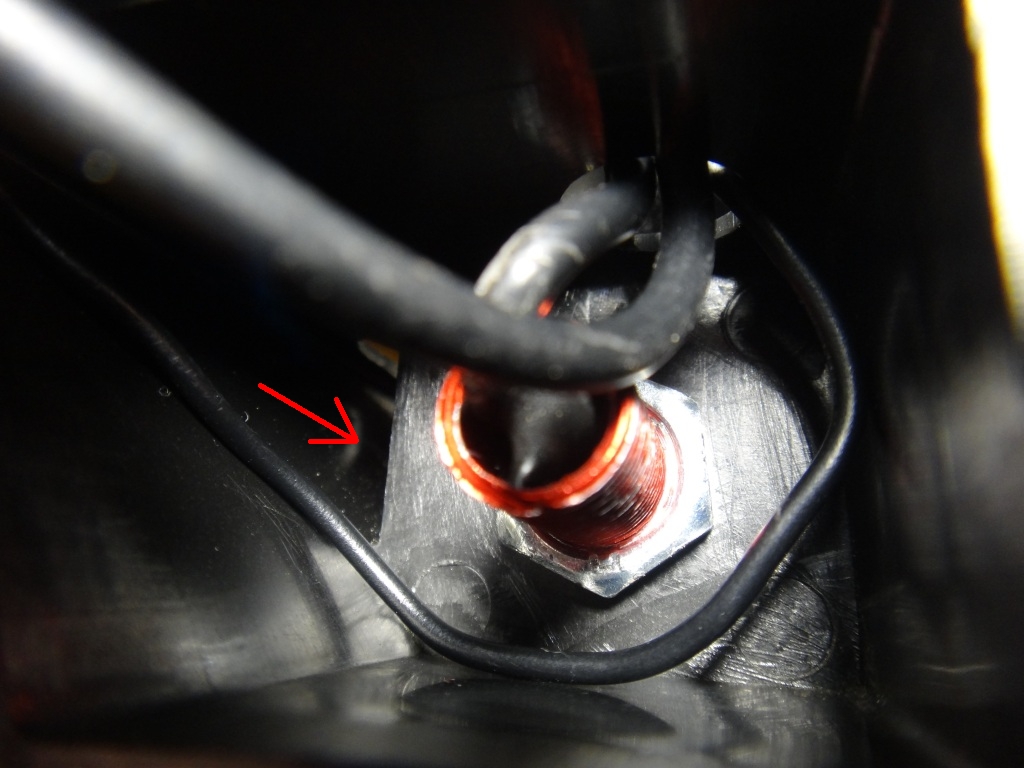 На фото красной стрелкой показано, в какую нишу надо вставить конец антенны сигнализации (чёрный провод) - до самого конца ниши, а остатки провода антенны нужно оставить внутри пластикового кармана, в котором находится светодиод габаритных огней самоката. Внутри пластика антенна отлично принимает сигнал, а внутри металла сигнала почти нет.