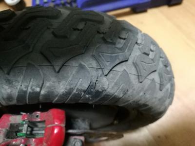 Рез широкий, корд порезан. Заклеили на шиномонтаже обычной заплаткой, вроде держит.