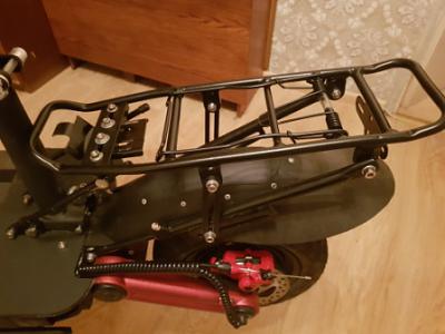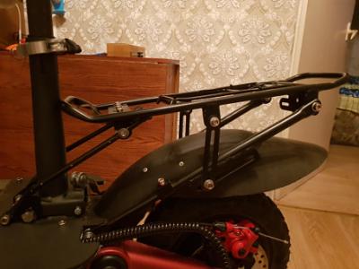 По поводу багажника. Выбирал долго, основное условие было что бы можно было комбинировать с крепежом. Он ещё не доделан. Планирую ещё поставить вертикальный крепёж, ближе к стойке сиденья и ещё застёжку, быстро отстёгивающуюся  от стойки к переду багажника. Хотя, уже сейчас, всё крепко сидит. Смело поднимаю самокат держась за зад багажника и за руль. Спереди кронштейн самодельный, где то лишнее отрезал, где то просверлил, ну и всё под покраску так чтобы красиво было и смотрелось как родное. И ещё хочу переделать кронштейн для переноски на  плечевом ремне. Её видно в той части багажника который ближе к стойке сиденья. Он сдвигается в перёд и получается как замок.Переделаю сам "носик" так что бы он лучше фиксировался в застёгнутом положении.Но даже эта уже держит сложенный руль и одновременно на неё можно одеть один конец переноски.