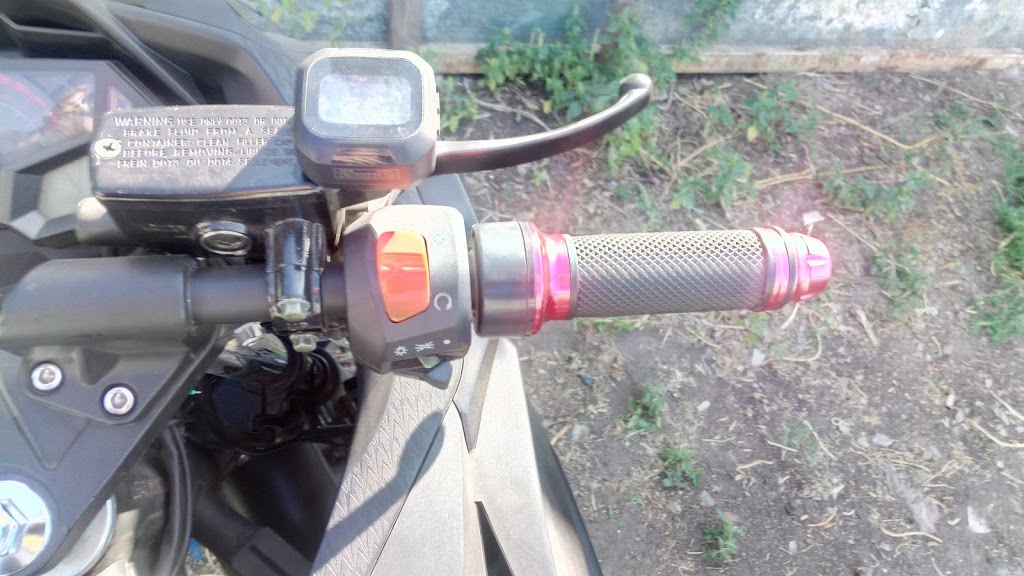 Отрезал курок,  выкинул начинку для газа, чуть подрезал,  немного не влезал и поставил на левую сторону руля. Светодиоды яркие,  хорошо видно на солнце...  Есть такие же с желтым и красным цветом светодиодов,  но они очень слабенькие, тусклые...  Вольтметр подключил через комплектный тумблер,  правда пришлось  перепаивать, тумблер был завязан через контроллер и курок газа...  Правда вольтметр немного врёт,  показывает на пол вольта больше,  но это не критично ;)