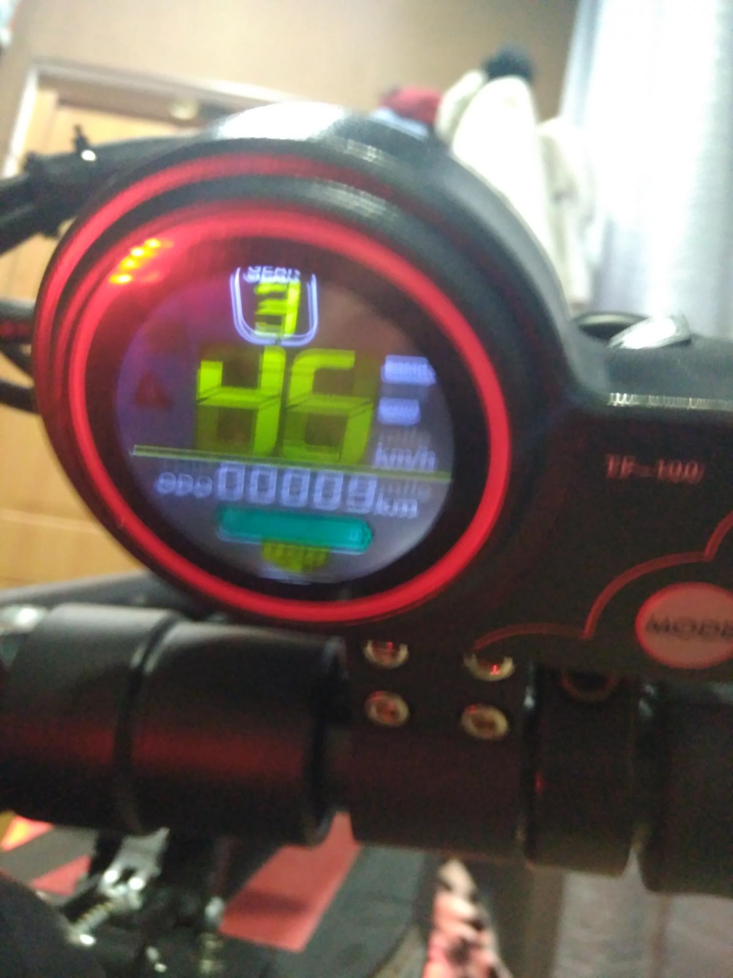 Км 4 проехал, батарея полная. Холостой ход и 3 скорость выдает 45 км в час. Ещё обнаружил юсб вход на спидометре и странный синий индикатор на экране синим цветом горел, похож на знак ближнего света